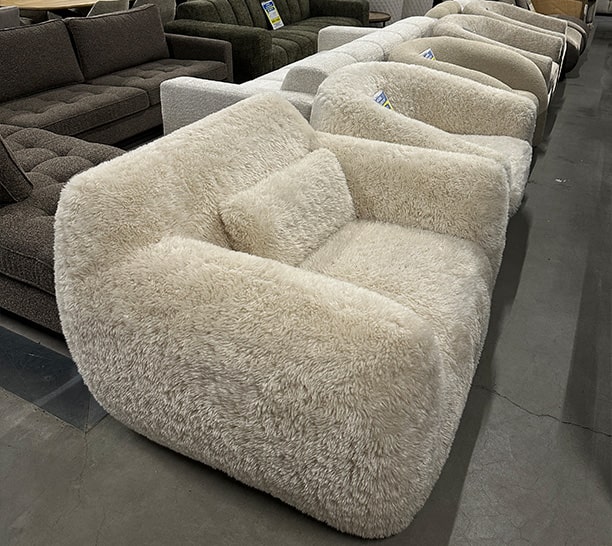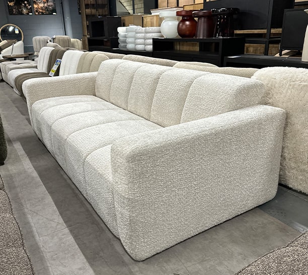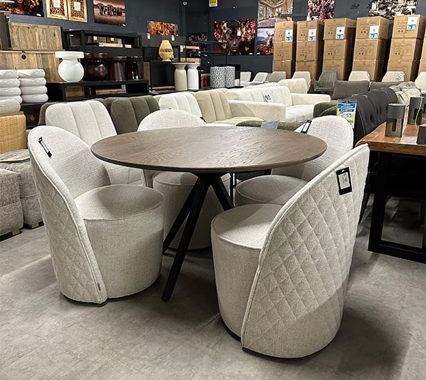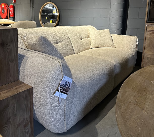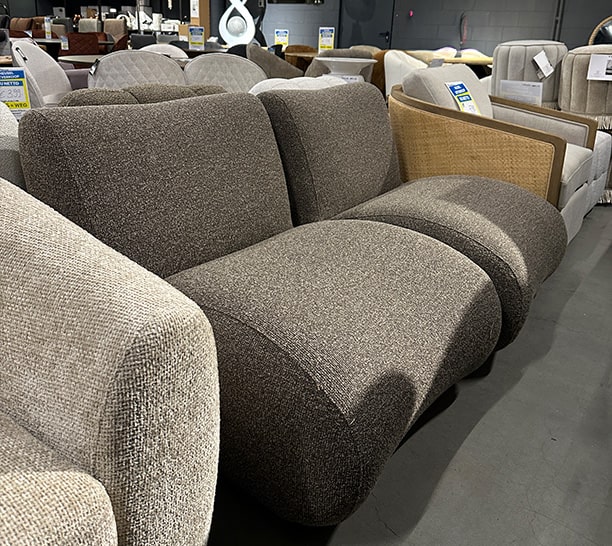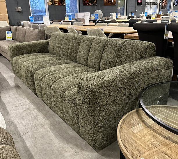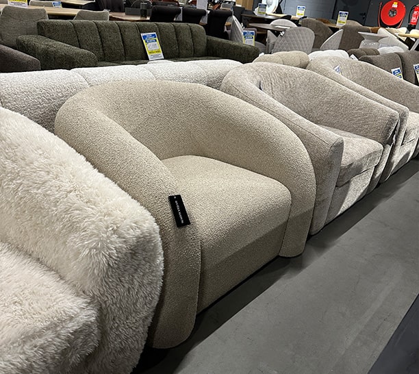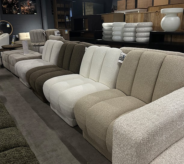 De meubels uit deze partij kenmerken zich door zachte stoffen, rustige kleuren en een tijdloos design. Denk aan comfortabele banken, elegante fauteuils en trendy poefs.