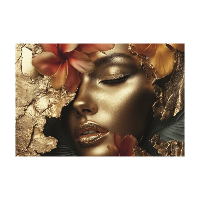 Glasschilderij vrouw met gouden tinten van het merk Ter Halle is 120 cm breed en 80 cm hoog. Op dit schilderij zie je een artistiek portret van een vrouwelijk gezicht dat volledig in gouden tinten is weergegeven. Dit schilderij is gemaakt van glas. Een glasschilderij heeft levendige kleuren, een realistisch diepte-effect en een glanzende afwerking.