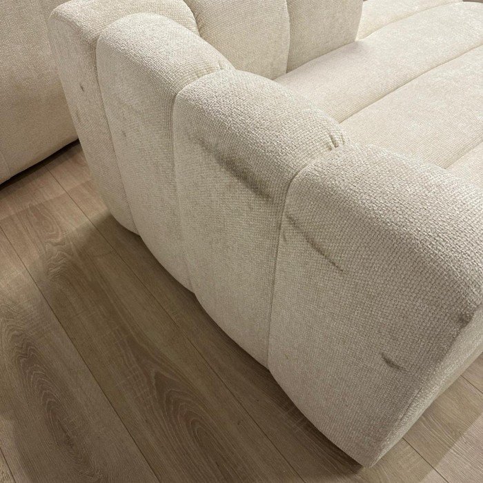 De lichtbeige polyester bekleding voelt zacht aan en geeft een rustige, elegante uitstraling aan je woonkamer. Dankzij de neutrale tint is deze hoekbank eenvoudig te combineren met verschillende woonstijlen, van Scandinavisch en modern tot klassiek en landelijk.