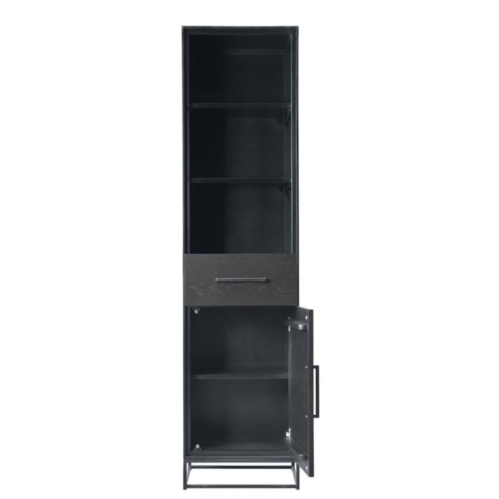 Met een hoogte van 193 cm en een breedte van 49 cm biedt de Veneta voldoende ruimte voor boeken, decoratie of persoonlijke accessoires. De kast beschikt over drie open vakken, één lade met softclose-systeem en één deur met visgraatstructuur — een combinatie die zorgt voor zowel open presentatie als praktische opbergruimte.