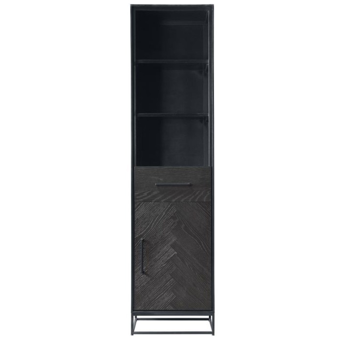 De Haluta Boekenkast Veneta is een stijlvolle en functionele kast met een luxe uitstraling. Uitgevoerd in zwart eiken fineer en afgewerkt met een subtiel visgraatmotief op de deur, brengt deze kast een moderne en chique sfeer in huis. De zwarte metalen poten en romp geven het meubel bovendien een stoer, industrieel accent.