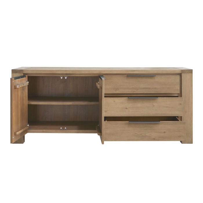 Met een breedte van 190 cm biedt het meubel volop opbergruimte. Achter de twee deuren en in de drie laden met softclose berg je moeiteloos servies, tafellinnen of andere spullen op. De metalen handgrepen voegen een modern accent toe en versterken het stoere, eigentijdse karakter van het dressoir.