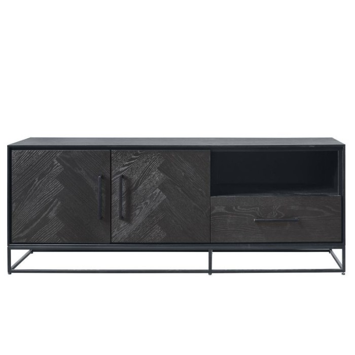 Het Haluta TV-meubel Veneta combineert een luxe uitstraling met praktisch design. Dit stijlvolle meubel is uitgevoerd in zwart eiken fineer en afgewerkt met een subtiel visgraatmotief op de deuren, wat zorgt voor een moderne en chique look. De zwarte metalen poten en romp geven het meubel een stoer, industrieel karakter dat perfect past in eigentijdse interieurs.