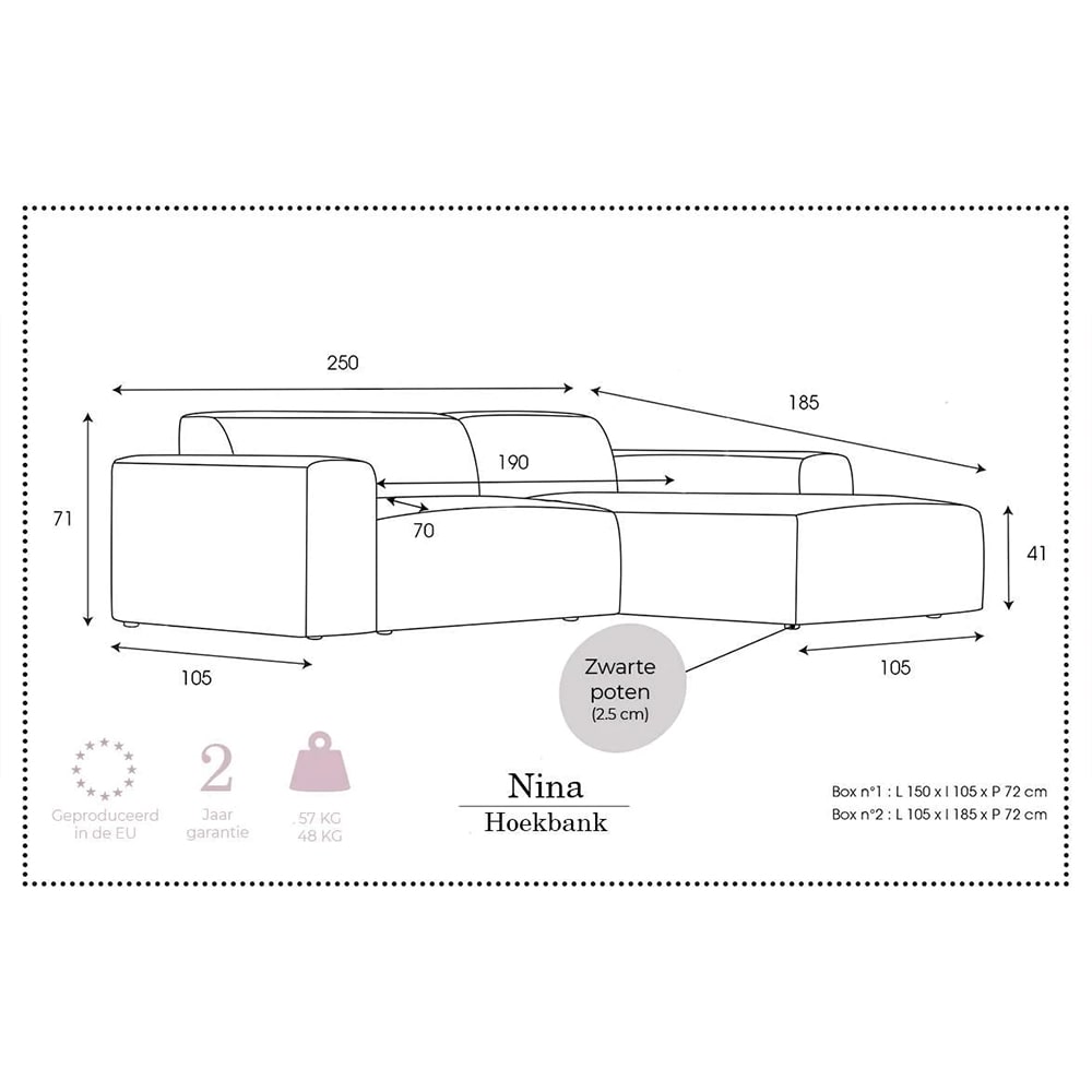Ruim en comfortabel – Met afmetingen van 250 x 185 cm biedt deze bank voldoende zitruimte.