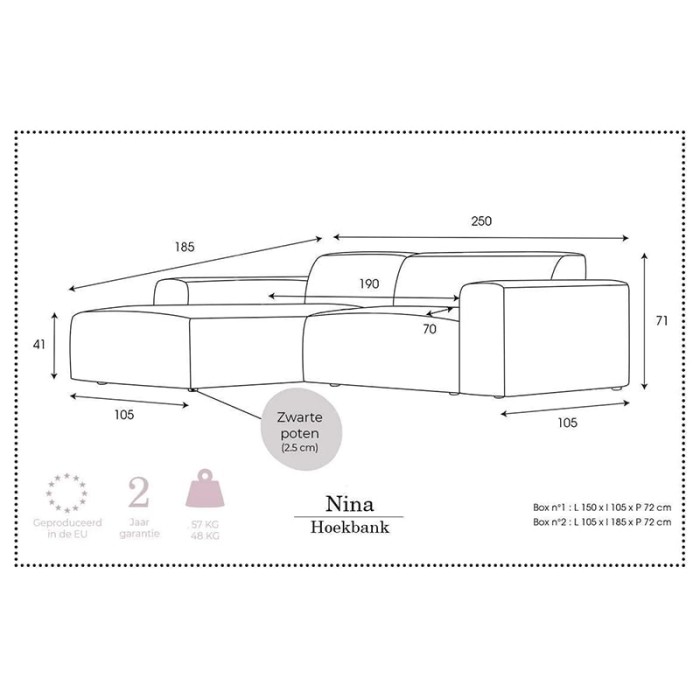 - Royale afmetingen: Met een formaat van 250x185x71 cm biedt de hoekbank Esmee voldoende ruimte voor ultiem zitcomfort.
