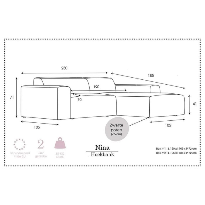 - Ruim ontwerp: Met afmetingen van 250x185x71 cm biedt de hoekbank voldoende ruimte om heerlijk te ontspannen of gasten te ontvangen.