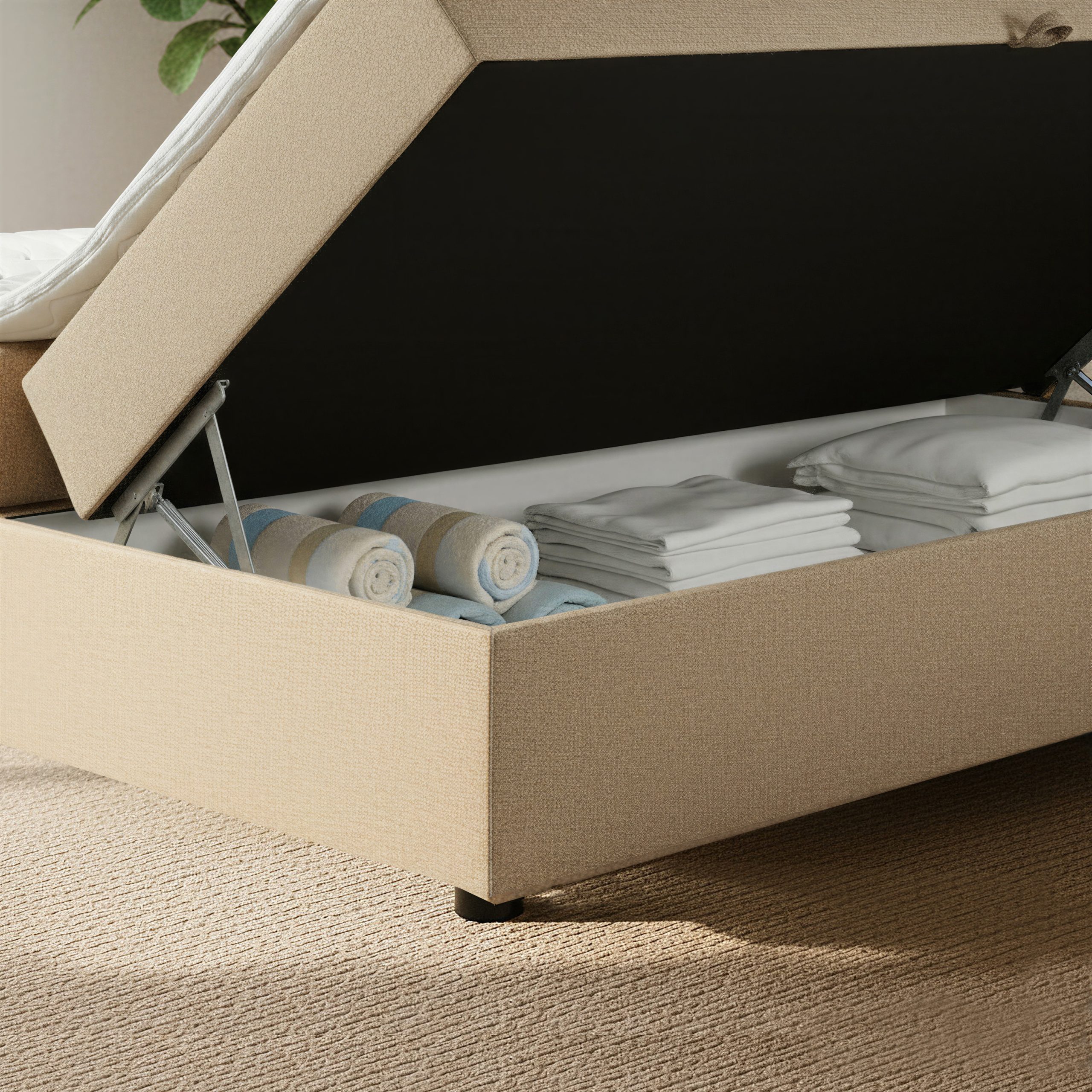 De opberg boxspring is voorzien van premium onderboxen van 30 cm dik en een mooi afgewerkt hoofdbord in dezelfde kleur als de boxspring. Samen met de 8 cm dikke antiallergische topper gemaakt van HR40, is deze opberg boxspring de ideale keuze voor een praktisch ingerichte slaapkamer met een mooi design en ultiem nachtcomfort. De opberg boxspring opent aan de zijkant is daarmee toegankelijk in elke slaapkamer.