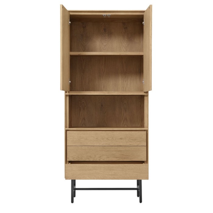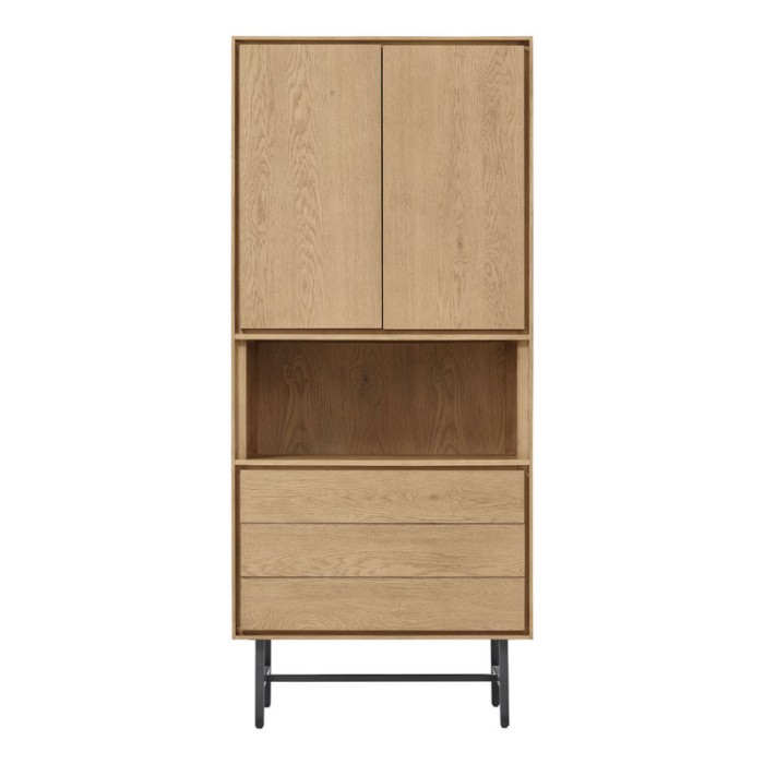De Haluta Opbergkast Belvio is een perfecte combinatie van natuurlijke elegantie en moderne functionaliteit. Uitgevoerd in licht eiken fineer met een strak zwart metalen frame, straalt deze kast rust en verfijning uit. Dankzij zijn slanke formaat van 85 cm breed past hij moeiteloos in kleinere ruimtes, zonder in te leveren op opbergruimte.