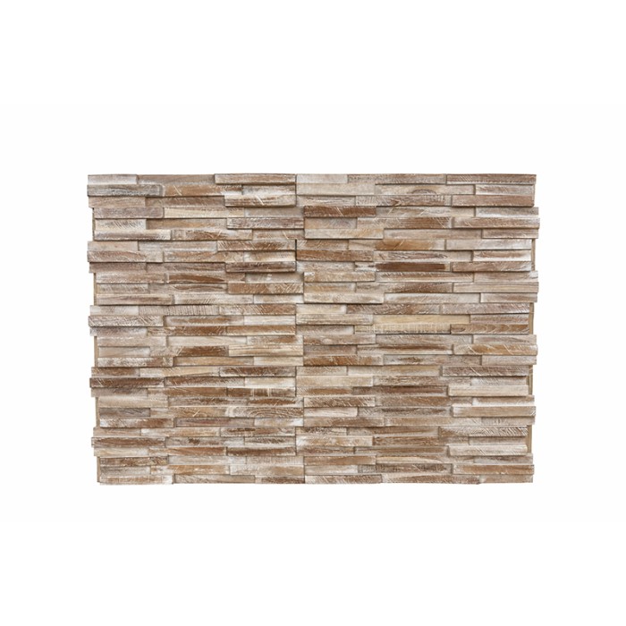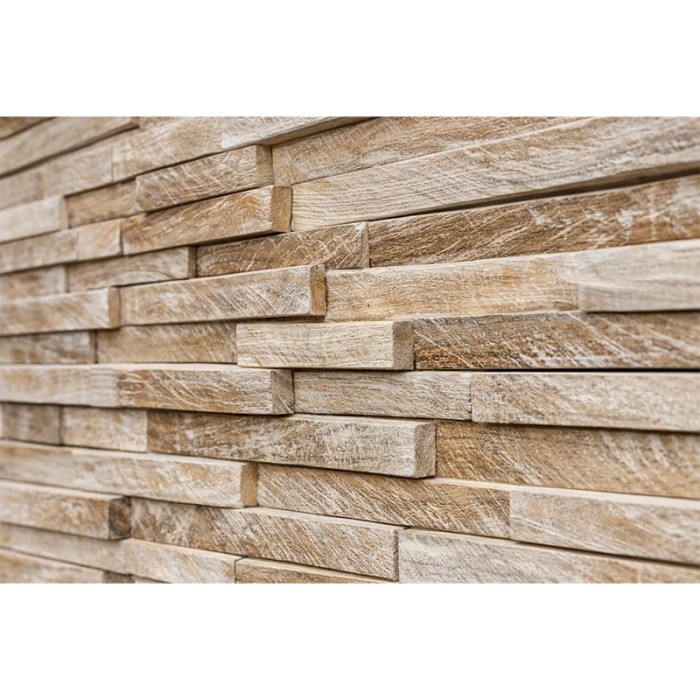 De wandpanelen zijn vervaardigd uit massief teak met een stijlvolle whitewash-afwerking, wat zorgt voor een warme, rustieke uitstraling met een natuurlijke houtnerf. Door de 3D-structuur lijken de panelen op opgestapelde houten planken, wat visuele diepte en karakter geeft aan elke ruimte.
